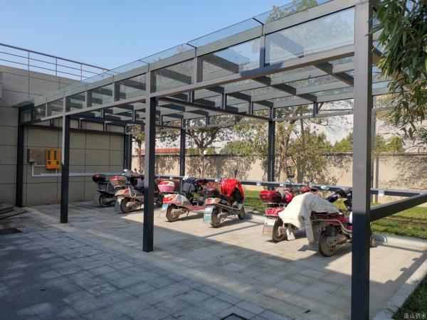 近期,经公司批准,南片水厂食堂北面建造起了一套电瓶车集中充电设施,彻底消除了电瓶车充电带来的安全隐患。选用的智能充电系统,具有充电完成自动断电;每次充电满4个小时,自动断电的功能,且每辆电瓶车均为单路充电,确保充电安全,防止火灾的发生;在考虑车棚材料选择上,采用不燃材料钢化玻璃及铝合金方管进行搭建,安全得到进一步保障。