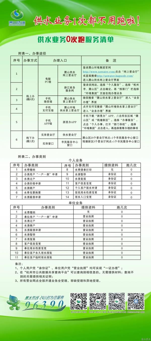 为不断提高萧山百姓的用水服务满意度,供水公司认真贯彻落实“最多跑一次”改革和优化营商环境的要求,制定了供水业务0次跑服务清单,包括14项个人业务、11项单位业务。