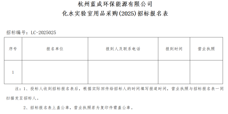五、发放招标文件时间:2025年 8 月 25 日至2025年 8 月 29 日。每天上午9:00~11:30时,下午13:00~16:00时(北京时间),在杭州蓝成环保能源有限公司领取招标文件。报名可盖章扫描件的形式传送,招标文件可电子版的形式发出。