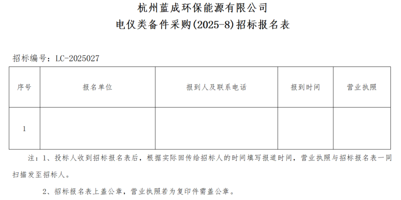 一、招 标 人:杭州蓝成环保能源有限公司,招标编号:LC-2025027。