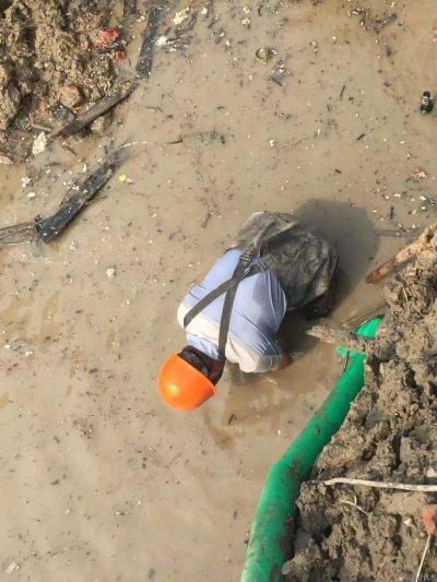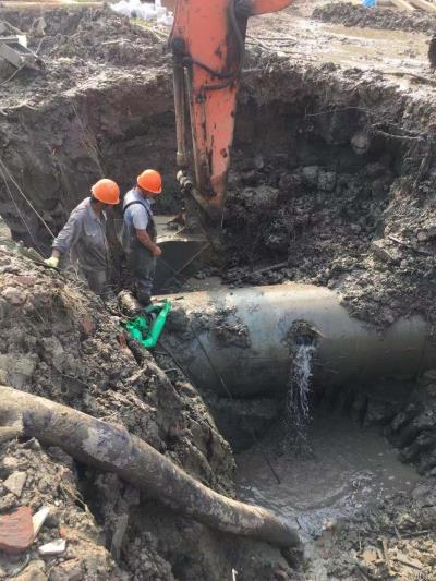供水公司接到通知后火速赶往现场,通过查看,发现原水管以破洞形态被损坏。工作人员第一时间协商决定实施“抱箍”抢修。