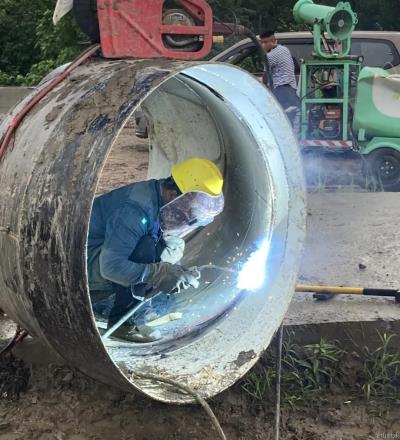 而连绵的雨水和基坑积水情况,也给割接过程中的电焊工作增加了操作难度。为了安全高效完成电焊任务,现场管理人员及时协调,尽量在雨势较小时进行电焊操作,同时安排专人撑伞遮雨;基坑使用水泵持续性抽水,隔绝水电的接触,保障割接工作安全平稳地推进。