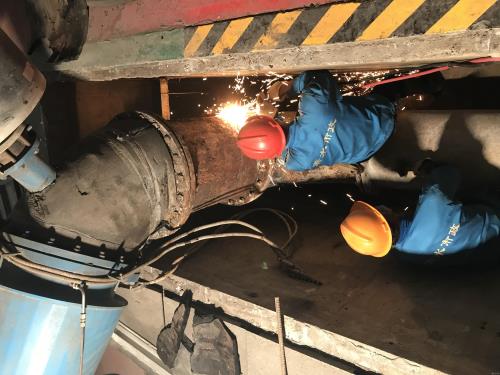 为此,该厂决定将锈腐的铸铁风管弯头更换为不锈钢风管弯头。为将更换施工对生产运行的影响降至最低,该厂精心制定维修计划,尽量缩短维修时间,关闭风机中间的联通阀门,调节二期与三期之间的水量。维修人员克服作业空间小,螺母锈死等困难,历时8个小时的连续作业,泄漏风管更换顺利完成,为钱江水处理厂安全平稳运行生产打下坚实基础。