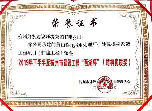 5月11日,临江水处理厂扩建工程捧回2019年下半年度杭州市建设工程“西湖杯”(结构优质奖)证书。