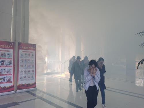 中午12:30分,伴随着滚滚“浓烟”,参演人员克服心理压力,用湿毛巾捂住口鼻,井然有序地猫腰撤出“火场”。在灭火器实操环节中,参演人员听取安全员讲解,依次在上风口距离火源2米处,对火源根部进行喷射,并由安全员纠正操作步骤。