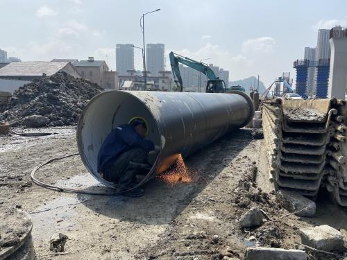 前期准备工作就绪后,抢修拉开序幕。在技术人员现场指导下,围护、开挖、切割、焊接、回填等各项工作有序开展。经过29小时紧张施工,四节总长20米的砼管更换工作顺利完成,义桥泵站DN1000污水管恢复通水。